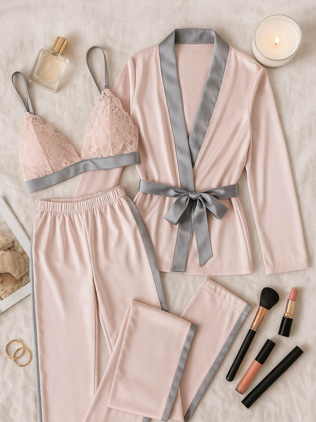 BEAUTY SATEN SABAHLIK BUSTİYER ALT 3LÜ SET PEMBE