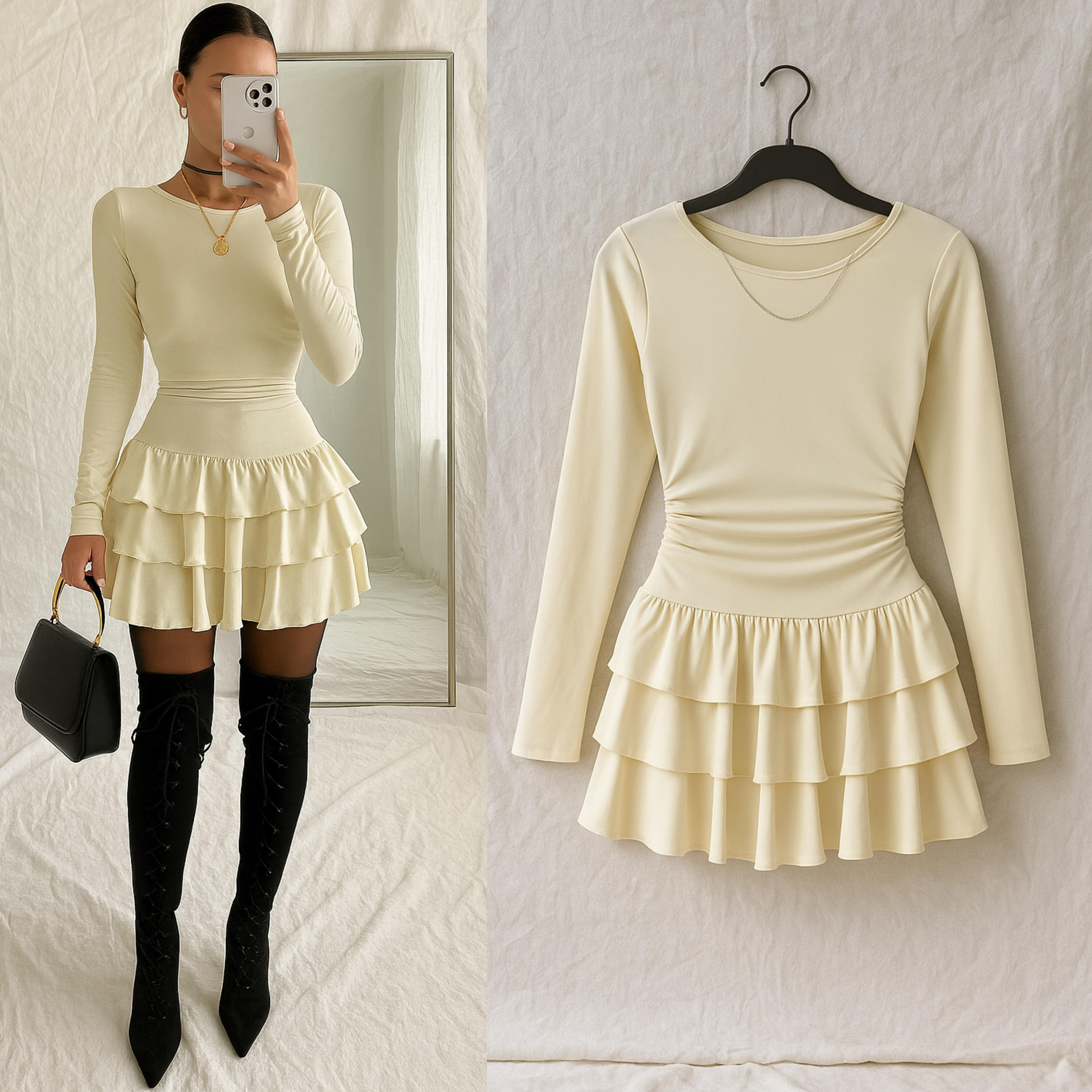 MARINYA FIRFIRLI MİNİ ELBİSE EKRU